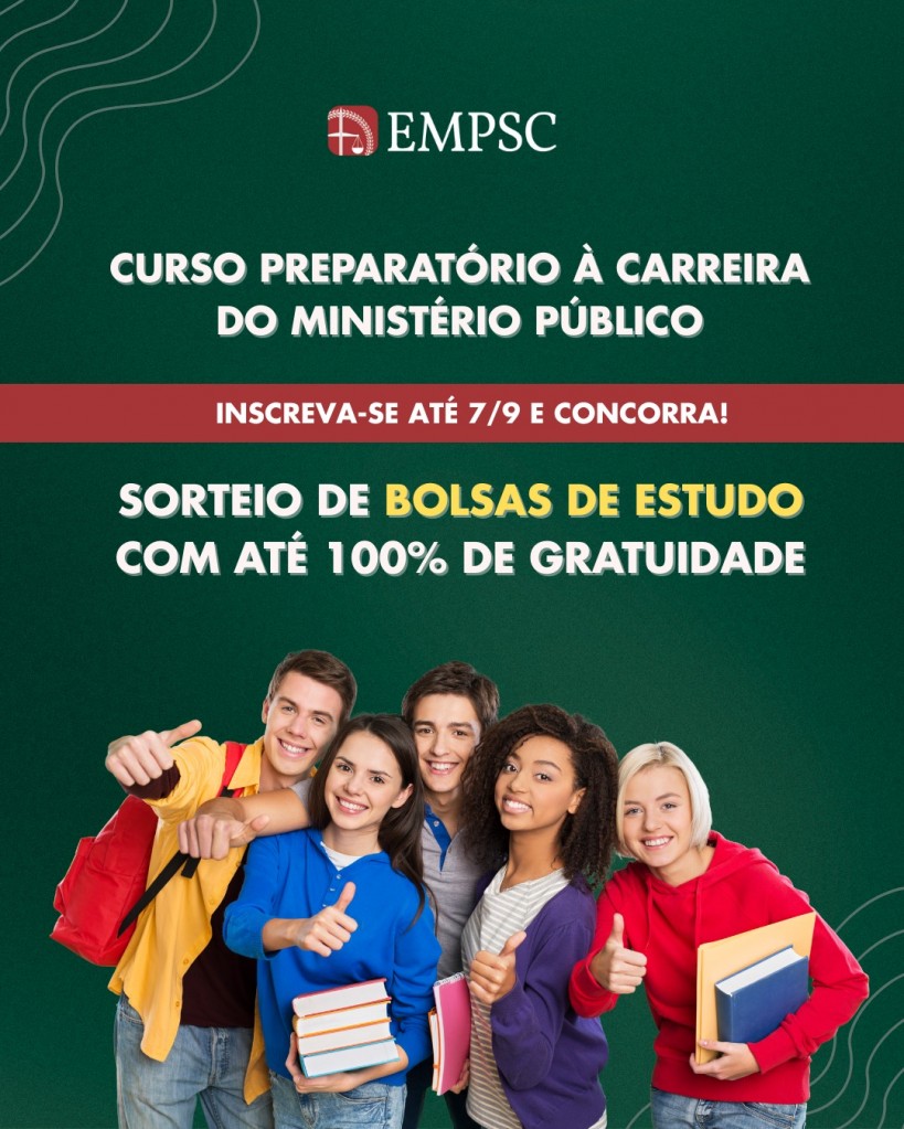 A Escola do Ministério Público de Santa Catarina (EMPSC) está oferecendo bolsas de estudo com descontos entre 25% e 100% para o Curso Livre de Preparação para Ingresso à Carreira do Ministério Público - Turma 2025 II.